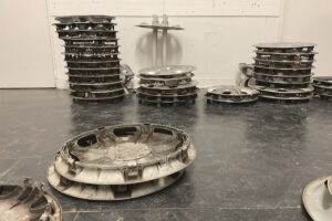 Sie bestehen entweder aus dem Kunststoff Polyamid (PA) oder aus Polypropylen (PP), welches jeweils als Monomaterial vorliegt. Zusätzlich sind Drähte zur Stabilisierung angebracht. Der erste Schritt bei der Verarbeitung der Radkappen ist das Säubern. Ruß muss abgewaschen und die Plastikverstrebungen weggestemmt werden, so dass der Kunststoffkorpus vorliegt.