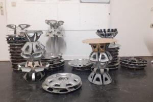 Nach umfangreichen Bearbeitungsmethoden und Experimenten, fügt sich nun der Prozess der Entwurfsarbeit an. Runde Formen wie Scheiben, Kugeln, Ringe bestimmen den Prozess der Formgebung. Dabei kristallisieren sich Formen, die an Schalen und Schüsseln erinnern heraus. Die besondere Art und Weise des kreativen Designprozesses liegt bei dem Upcycling-Entwurf tatsächlich in der Beschäftigung mit dem Material. Wenig zweidimensionale Entwurfsskizzen, vielmehr die Aneinanderreihung von dreidimensionalen Prototypen und Grundkonstruktionen bestimmen die Kreation der Produkte. Die Form kommt aus dem Material und den Bearbeitungsprozessen, die Funktion entwickelt sich erst als letzte Komponente. Es entstehen Schalen, Kleinmöbel, Skulpturen und Kunstobjekte. Damit wird eine erneute Wertschöpfung erreicht, die Radkappe startet einen neuen Lebenszyklus.