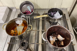 This is followed by the question of surface treatment. The gray surface of the hubcaps is scratched and unsightly due to the wear and tear of road traffic. Natural coloring can be used to refine the outer and inner surfaces. This involves boiling a decoction of madder root and bluewood and dipping or steaming the objects. This results in a red-purple or blue coloration of the surface. Further refinement was achieved by applying a layer of gold leaf. The third option is to cover the surface with lyocell fibers, which are industrially produced from wood. In this manufacturing process, 99% of the solvents used, which are non-toxic, are kept in circulation. The adhesive and the lyocell fibers are biodegradable.