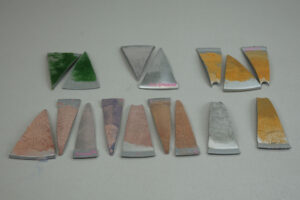 Danach folgt die Frage der Oberflächenbehandlung. Die graue Oberfläche der Radkappen ist durch die Abnutzung im Straßenverkehr zerkratzt und unansehnlich. Mit natürlicher Färbung können Außen- und Innenseiten veredelt werden. Dabei wird ein Sud aus Krappwurzel und Blauholz gekocht und die Objekte eingetaucht beziehungsweise eingedämpft. Damit erfolgt eine Rot-Lila- beziehungsweise eine Blaufärbung der Oberfläche. Eine weitere Veredlung wurde über eine Blattgold-Auflage erreicht. Die dritte Möglichkeit liegt in der Beklebung mit Lyocellfasern, die industriell aus Holz hergestellt werden. Bei diesem Herstellungsprozess werden 99 % der verwendeten Lösungsmittel, die nicht giftig sind, im Kreislauf gehalten. Der Klebstoff und die Lyocellfasern sind biologisch abbaubar.