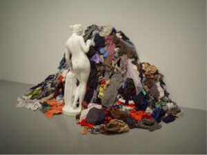 „Michelangelo Pistolettos ikonische, großformatige Skulptur, besteht aus einer klassischen Skulptur der Göttin Venus, die in einen bunten Hügel aus Lumpen und weggeworfener Kleidung starrt. Die inhärente Spannung, die zwischen den beiden auffallend unterschiedlichen Objekten besteht, führt den Betrachter dazu, eine Vielzahl von Widersprüchen zu betrachten.“
