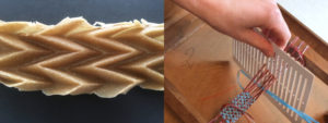 Mit Hilfe der Anleitung der Künstler Travis Joseph Meinolf und Kai Althoff und deren Arbeit „The weaving place“ von 2008 erlernen wir die Konstruktion eines Backstrap Looms. Danach suchen wir experimentelle Strecken und Verbindungen unter Stühlen und Tischen, im Backblech, von Kühlschrank-Griff zur Waschmaschine. Ähnlich den Netzen von Spinnen können die Arbeiten von Zeit zu Zeit wachsen und hybride Techniken hinzugezogen werden.