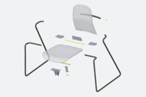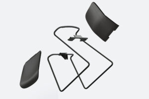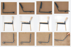 Die Bewegung resultiert nicht, wie bei Officechairs aus einer kompakten, einstellbaren, mechanischen „Blackbox“. LINC bildet mit dem*der Sitzenden und allen Teilen des Chairs eine holistische Mechanik: Durch die Kopplung der Rückenlehne mit dem Sitz wird beim Zurücklehnen die Sitzfläche nach vorne und oben bewegt und öffnet so den Winkel zwischen Rumpf und Beinen. Die Gewichtskraft der sitzenden Person bildet zu der Kraft aus der Rückenlehne die Gegenkraft und passt sich dieser automatisch an.
