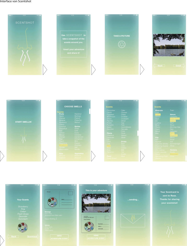 die Vorstellungskraft an. Durch Scentshot erhält man die Möglichkeit, seine Erlebnisse zu teilen, indem man sie in Düften zusammenfasst und verschickt. Scentshot besteht aus einer App, in der man eine Duftkarte seines Erlebnisses erstellen kann und verschickt, um Andere an diesem Erlebnis teilhaben zu lassen. Die Duftbibliothek der App enthält die unterschiedlichsten Gerüche aus denen man auswählt. Diese Gerüche sind auf der Karte zusammengefasst. Der Empfänger der Karte wird eingeladen mit in das Erlebte einzutauchen und ist mit den Sinnen dabei.