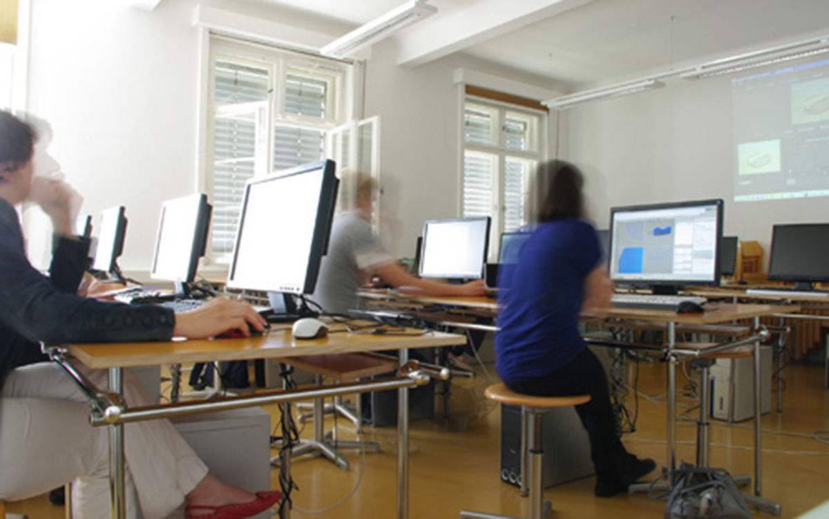 Im PC-Lab stehen 16 Windows-Rechner zum selbstständigen Arbeiten. Auf den Rechnern finden sich unter anderem folgende Programme: Illustrator, Photoshop und InDesign CS5 sowie SolidWorks und Rhino.