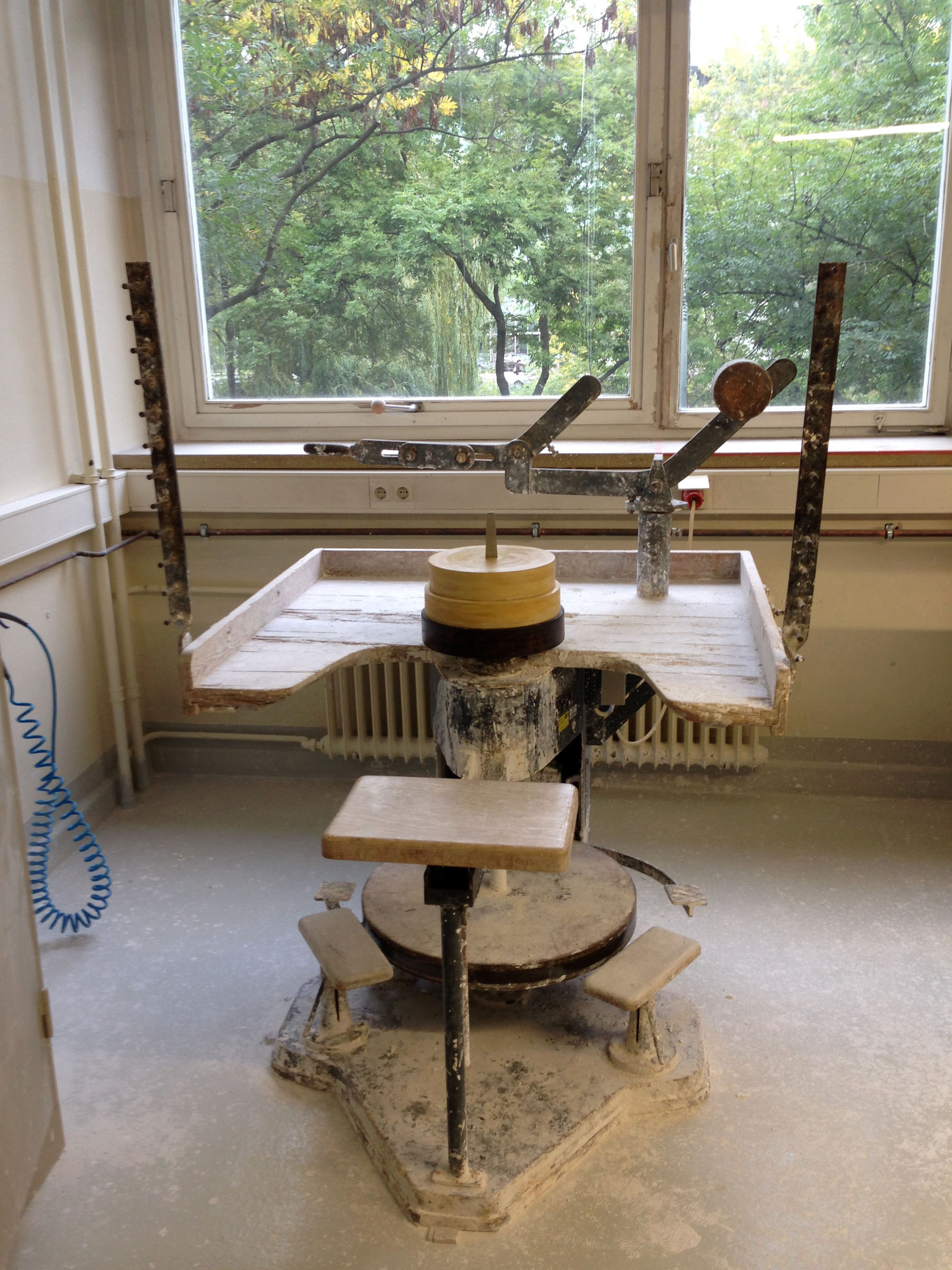 Die Drehscheibe dient dazu, rotationssymmetrische Gussformen aus frisch gegossenem Gips mittels Abdreheisen zu bearbeiten.