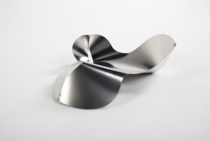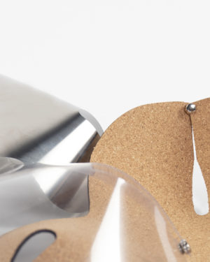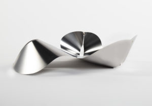 In the final project, the spring steel centerpiece is an evolution of the study prototype of the white reef_1 aperitivo plate. A single plane shape bends to become a two-dimensional object. In this branch of the project, the material itself hides the object of which it is made.